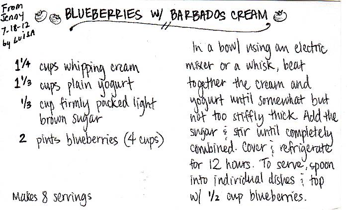 My sister Jennifer introduced me to a topping she calls Barbados Cream. Serve on fresh blueberries, strawberries or other fresh fruit. Thanks to Luisa for copying out the recipe.